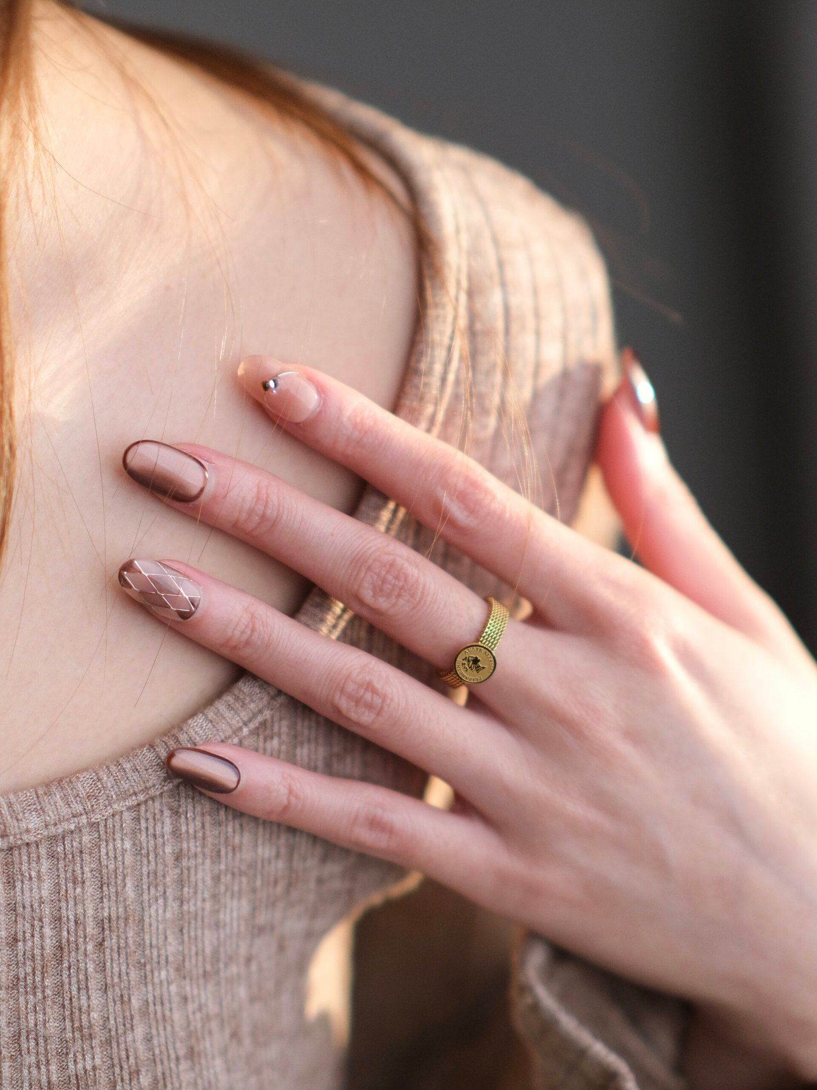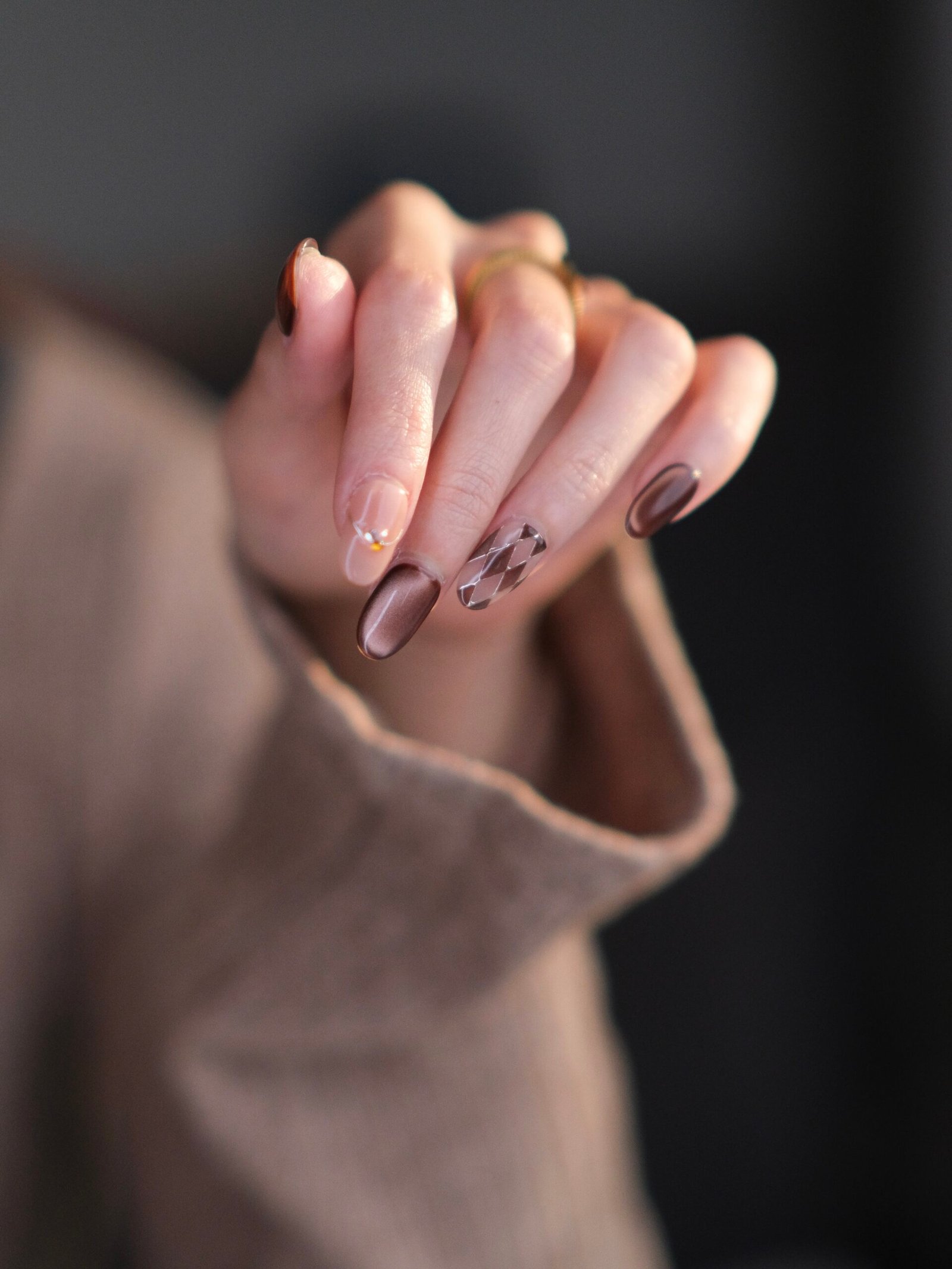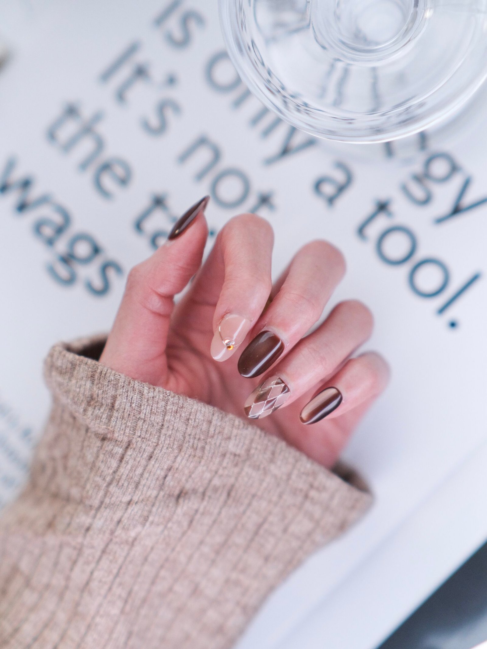 - Chic Date Night: Layer a caramel brown cardigan over a white turtleneck — let your nails echo the knit’s texture, with elegance hidden in the details.