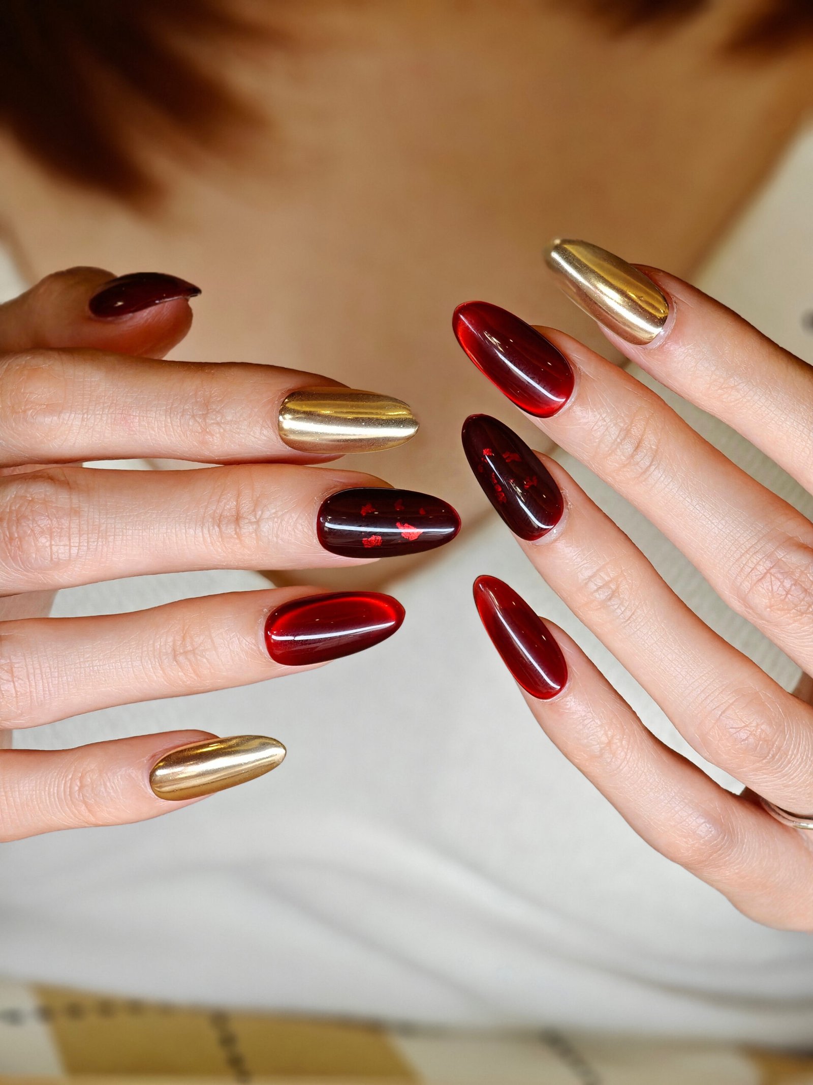 Born from the fusion of classical Eastern beauty and modern chic. Deep wine-red nails shimmer like midnight roses, kissed by scattered gold flecks — as if molten sunset spilled across your fingertips. We’ve woven passion into crimson poetry and folded twilight dreams into liquid gold.