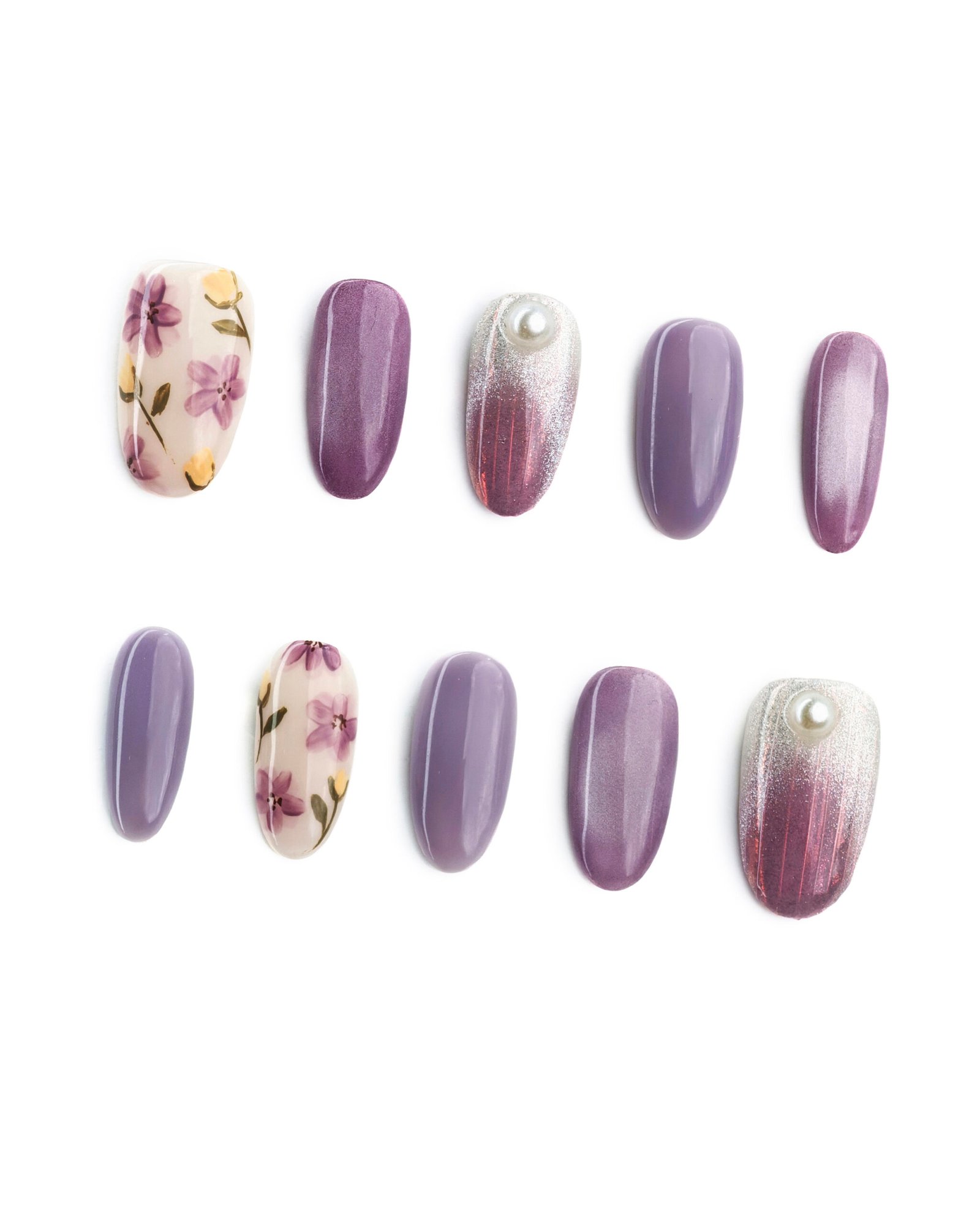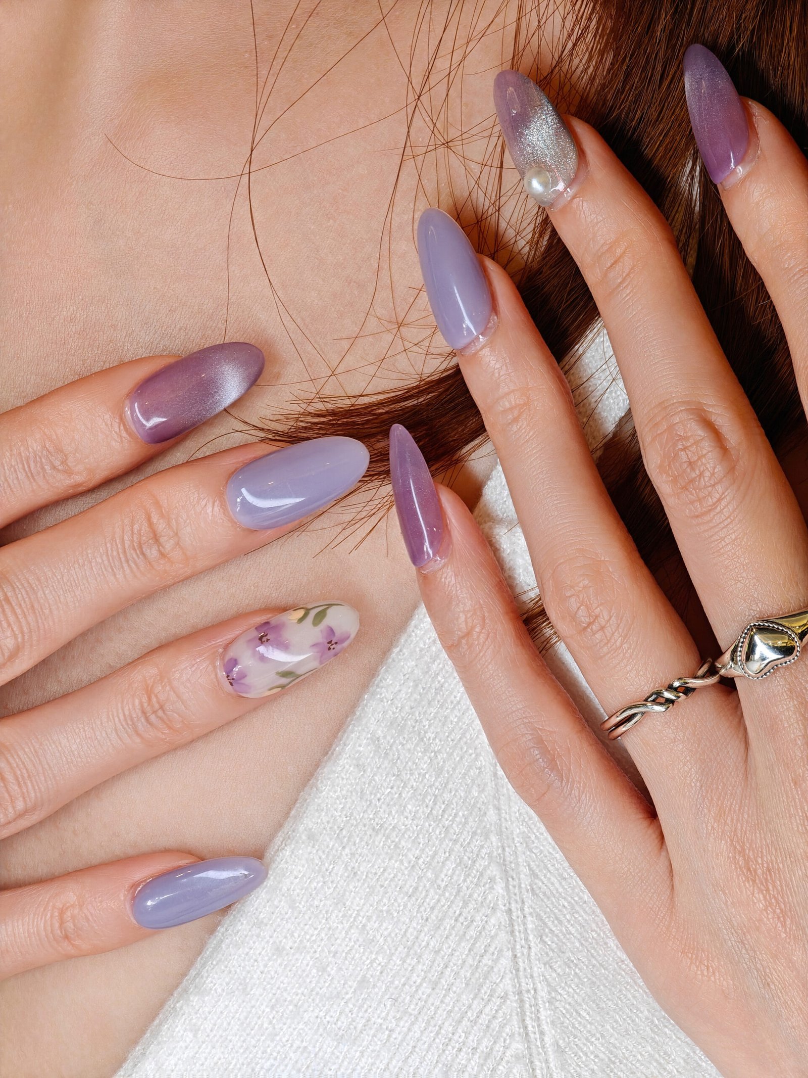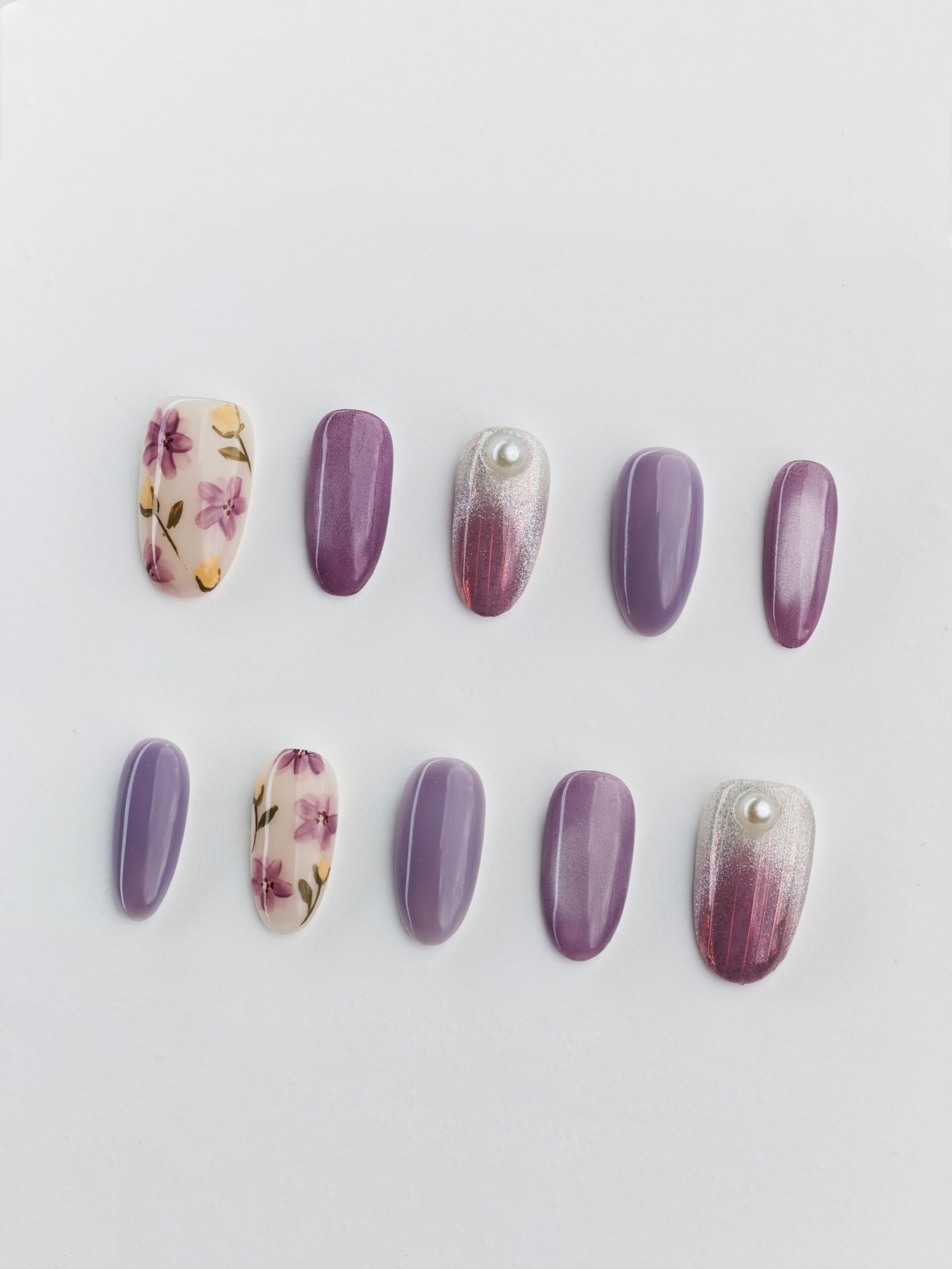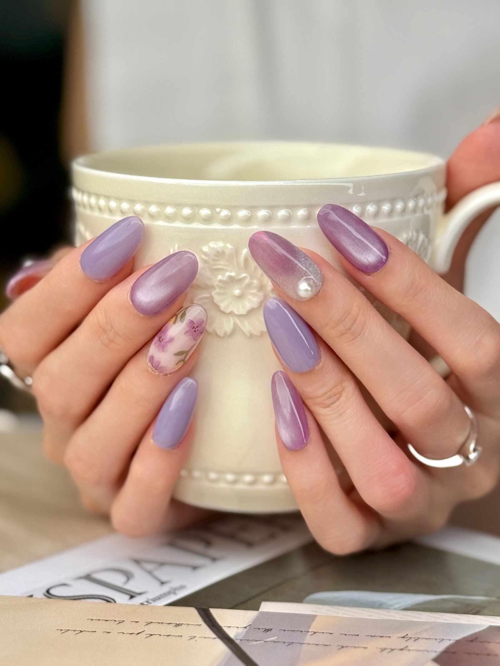 Morning sea blends iris purple into misty grey. We layer pearl-like shine over this base – shifting to moon-white as you move, like ocean waves kissing petals and leaving glowing trails.