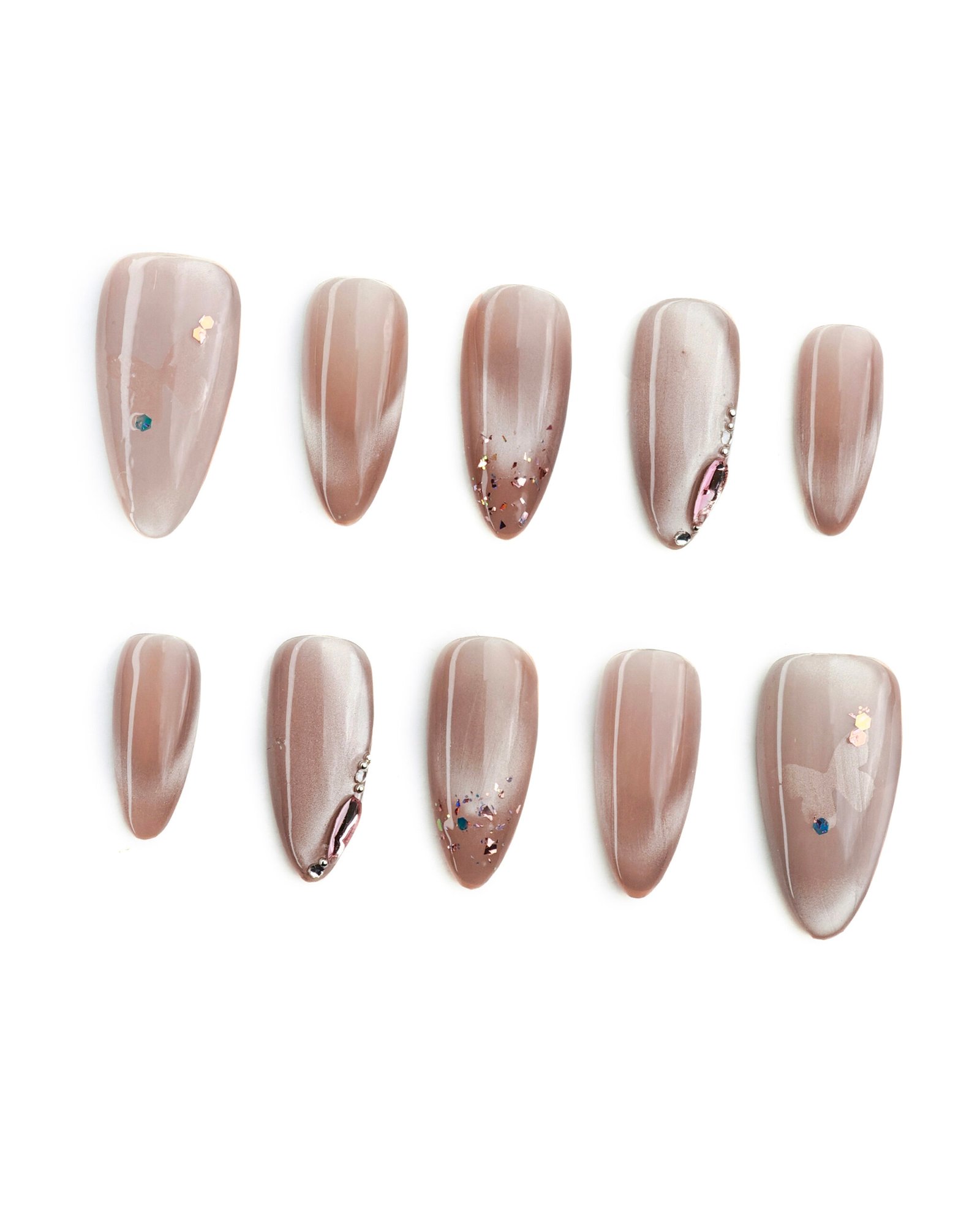 Soft blush pink mimics the gentle folds of dusk, while delicate crystal accents scatter like stardust from the Milky Way. Together, they weave a delicate tale of understated luxury and poetic elegance across your fingertips.