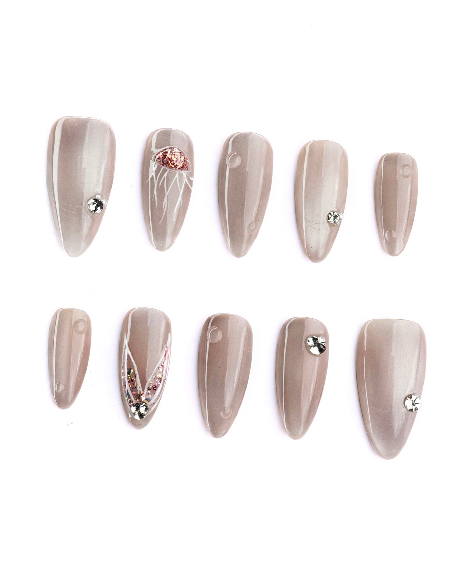 A sheer, misty gradient on a nude base creates a soft and translucent effect, reminiscent of the hazy silhouette of jellyfish drifting through the ocean. Delicate diamond accents mimic the shimmer of light catching on their trailing tentacles.